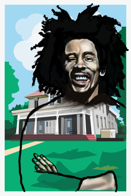"Roots of Revolution" is a powerful digital art piece that transposes Bob Marley onto the historic Frederick Douglass House, symbolizing the shared legacy of activism, freedom, and the fight for justice. The iconic Jamaican singer-songwriter, known for using his music to inspire social change, stands as a contemporary reflection of Douglass' relentless pursuit of emancipation and equality. Marley's posture is contemplative, embodying his message of unity and resilience.