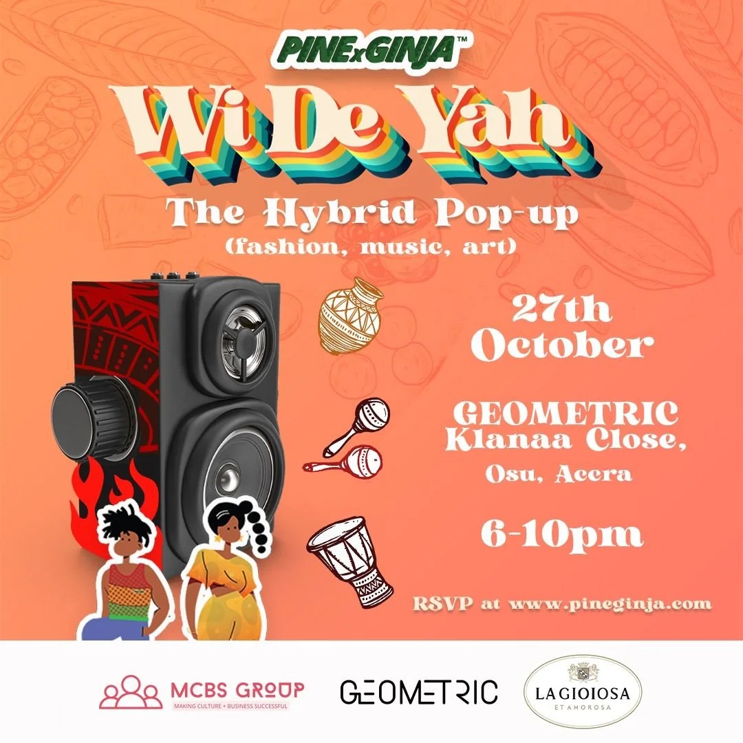 We De Yah!!! PinexGinja will be presenting an evening of Art, Fashion, Music and Food on 27 October at Geometric in Osu, Accra from 6-10pm GMT. Come out and chill with us for an eclectic blend of straight vibes. Powered by MCBS Group, Geometric and La Gioiosa. Spots are limited, so first come first served for RSVPS!!